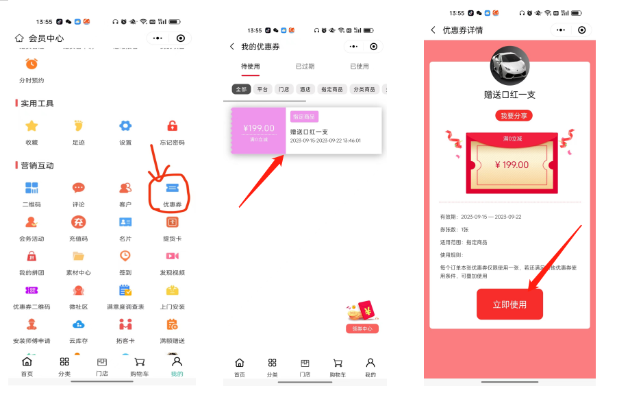 1.用户去到个人中心---点击优惠券---点击该优惠券,立即使用