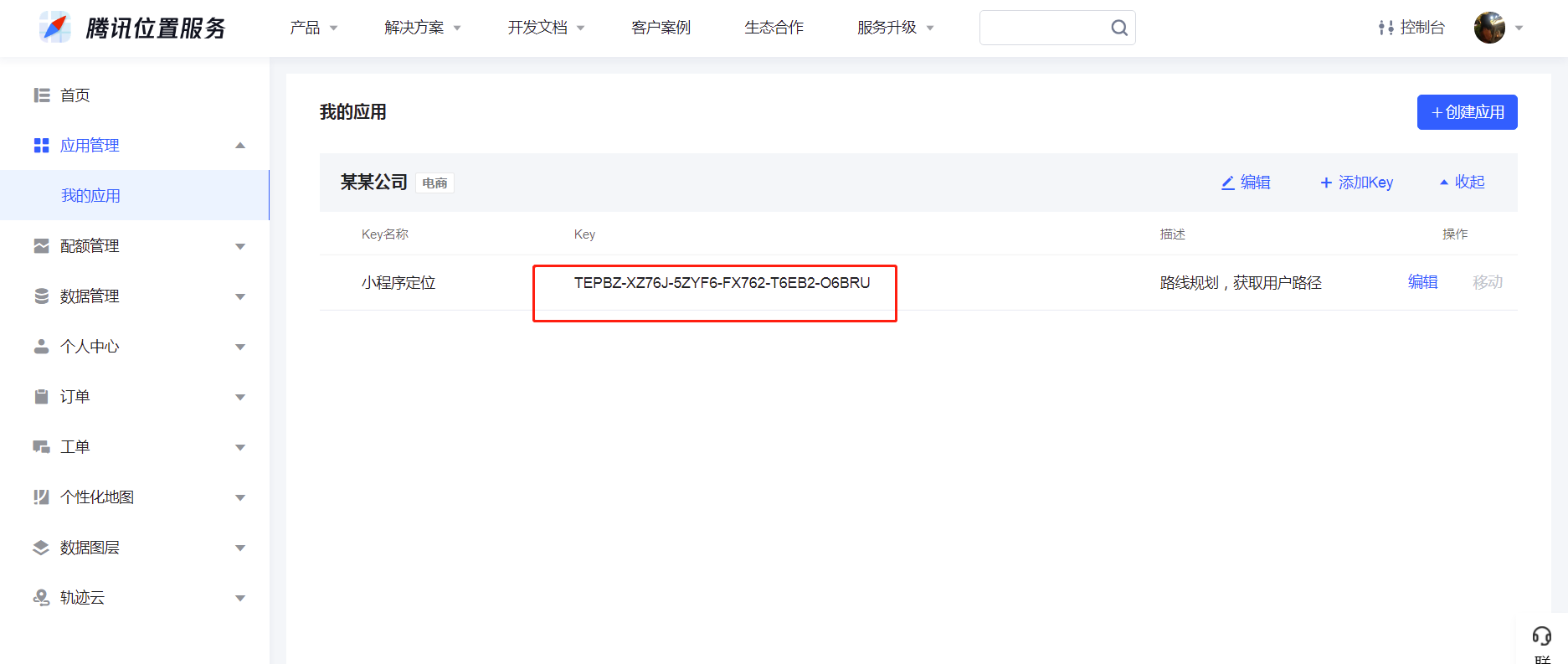 ⑤点击应用管理,我的应用,创建应用(添加key)