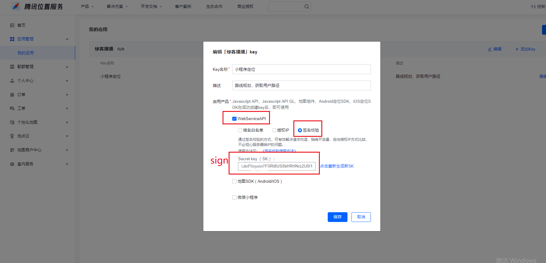 ⑩将获取的key和sign的数据复制粘贴到商城后台的 小程序key和sign里,最后保存。